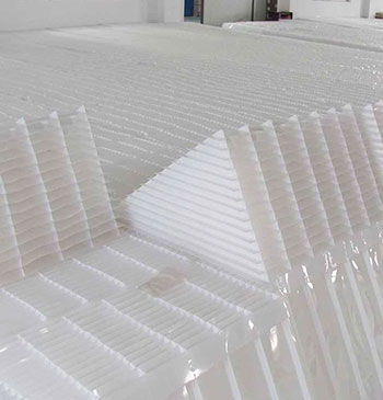 斜板填料主要由共聚聚丙烯材料制成。斜板填料按構(gòu)造型式可分為:小間距斜板 、接觸絮凝斜板和復(fù)合斜板,而我公司主要以生產(chǎn)小間距斜板填料為主。它由斜板片和肋條兩部分組成,外觀(guān)為平行六面體,側(cè)面為傾角60°的平行四邊形,斜板間距為25mm,板材與工字條之間間采用電洛鐵熱合焊接固定。